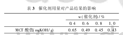不同催化剂量对反应的影响见表3(反应6小时后结果),可知固体超强酸对合成MCT有显著的催化作用,随着催化剂用量的增加,MCT产品酸值降得越低,但当催化剂用量为反应物总质量的0.8%时,MCT酸值趋于稳定,在增加催化剂用量,酸值降低不明显。因此,催化剂用量为反应物总量的0.8%最佳。