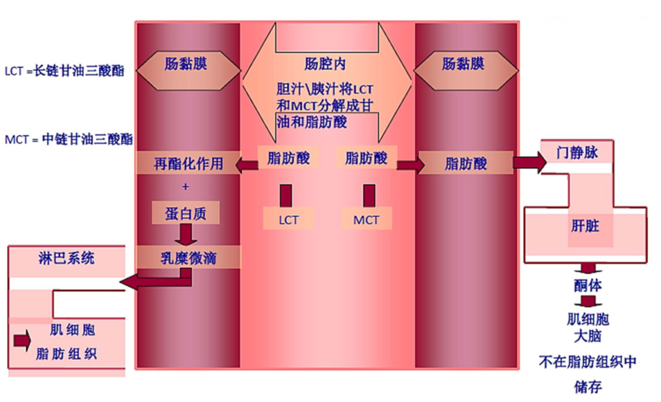MCT消化吸收路线和LCT(长链脂肪酸)是不同的,MCT脂肪酶迅速水解后,直接进入小肠上皮细胞,无需胆汁酸形成胶束。MCT较LCT更容易分解,而且分解速度特别快,中碳链脂肪酸吃3h后分解最大,食用10h几乎完全分解后,甘三酯不再在细胞中合成,而是直接从门静脉输送到肝脏,有效分解为能量,LCT通过淋巴管、静脉输送到脂肪组织、肌肉、肝脏,然后分解使用能量供应,剩余能量储存在皮下形成脂肪。