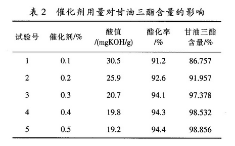 2、催化剂用量对甘油三酯含量的影响