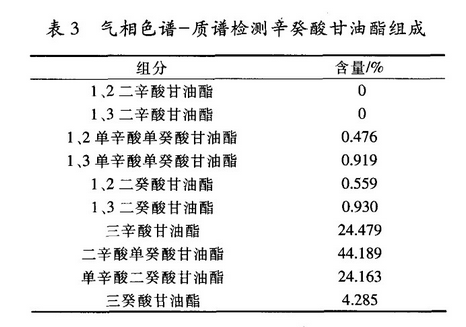 实验证明复合催化剂对辛癸酸甘油酯合成具有较好的催化效果,产品纯度较高,产品也不易着色,后处理比较容易,是一种优良的催化剂。在辛癸酸与甘油的摩尔比3:1,反应温度200 ℃,反应时间3 h,复合催化剂0.3%的条件下,可以得到高质量的辛癸酸甘油酯,甘油三酯含量达到97.116%,气相色谱-质谱检测产品的组成见表3: